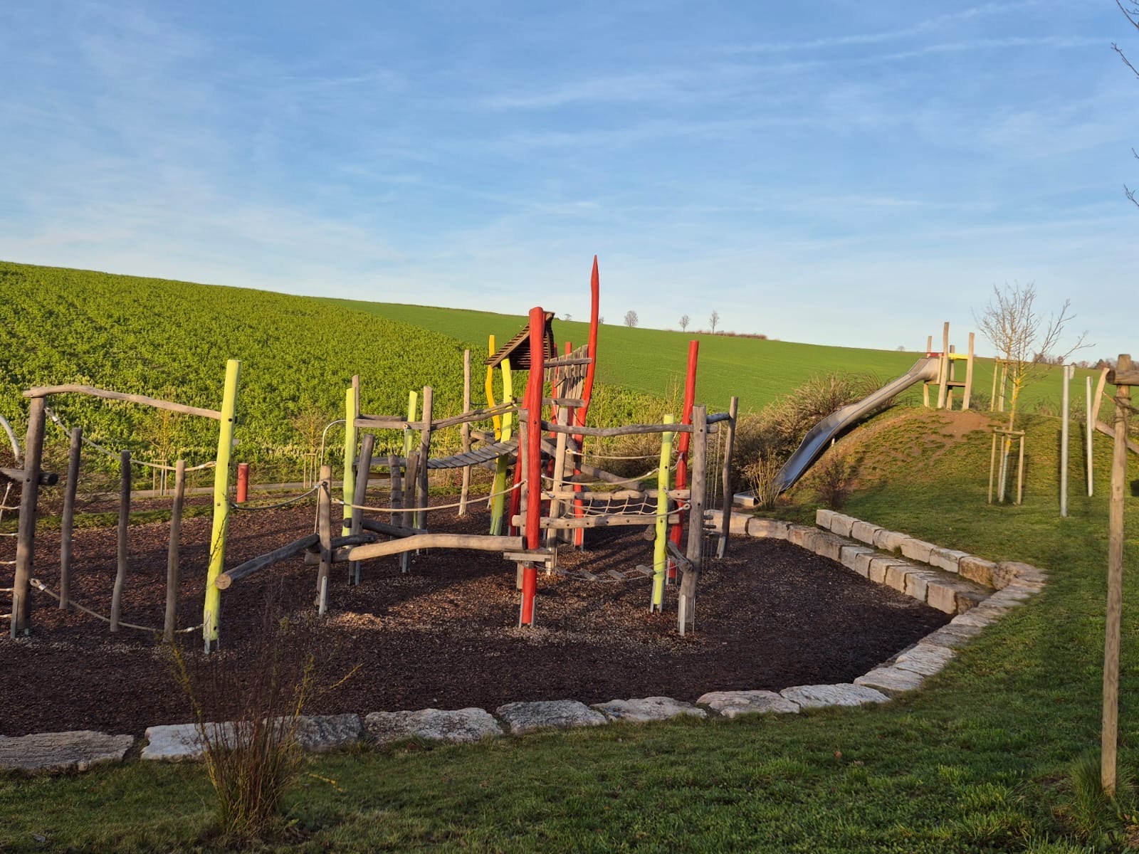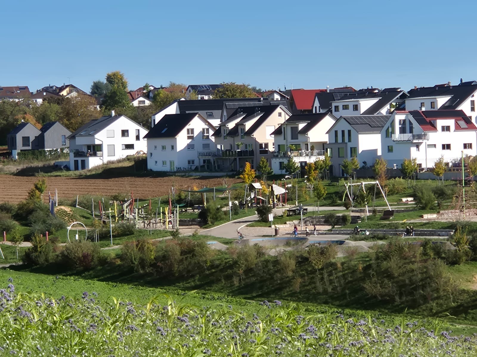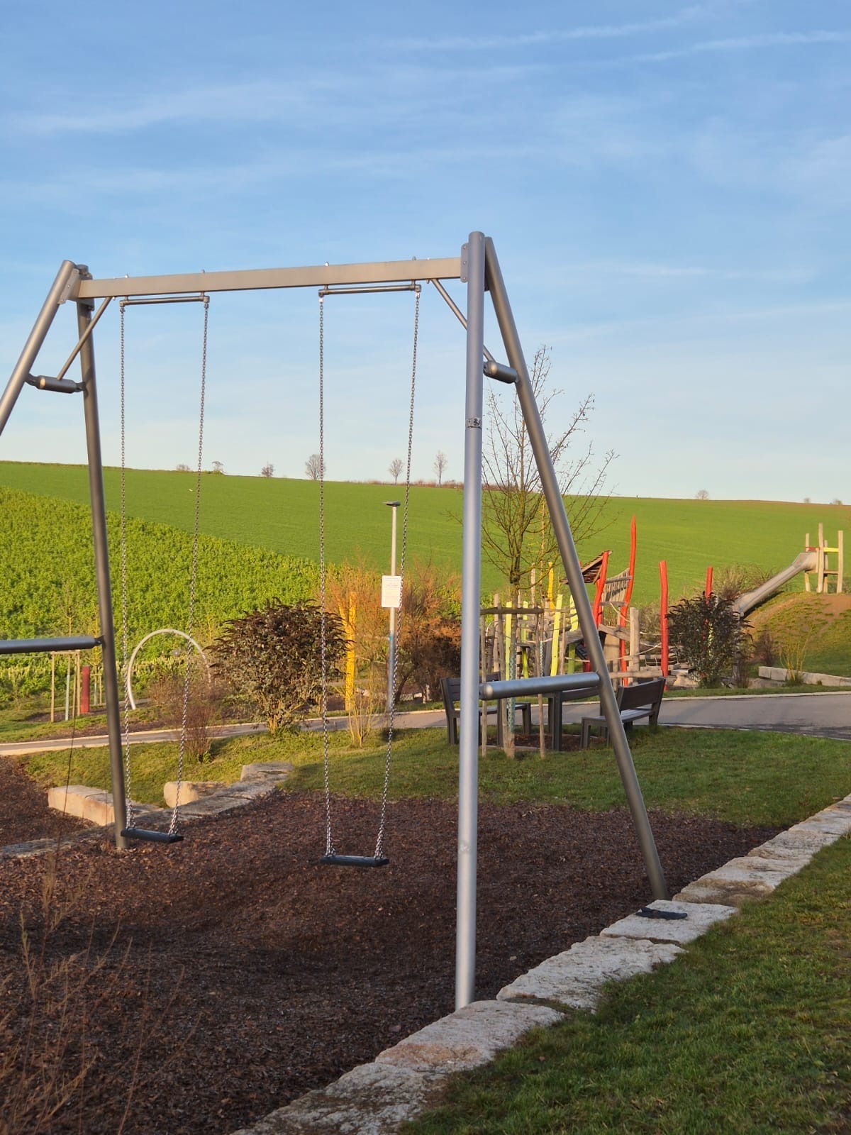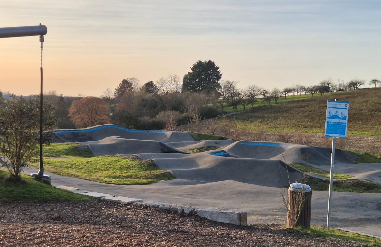 Andere Städte und Gemeinden bauen kleine Spielplätze mitten ins Baugebiet. Sie verlieren dabei viel Geld, indem sie die Fläche nicht als Bauplatz verkaufen. Und sie geben weniger Geld für die Spielgeräte aus. Wir haben auf einer preiswerten Fläche von über einem Hektar viel Geld in Spielwert investiert. Entstanden sind ein attraktiver Spielplatz und zusätzlich eine tolle Pumptrackanlage mit einem Dirtbereich.